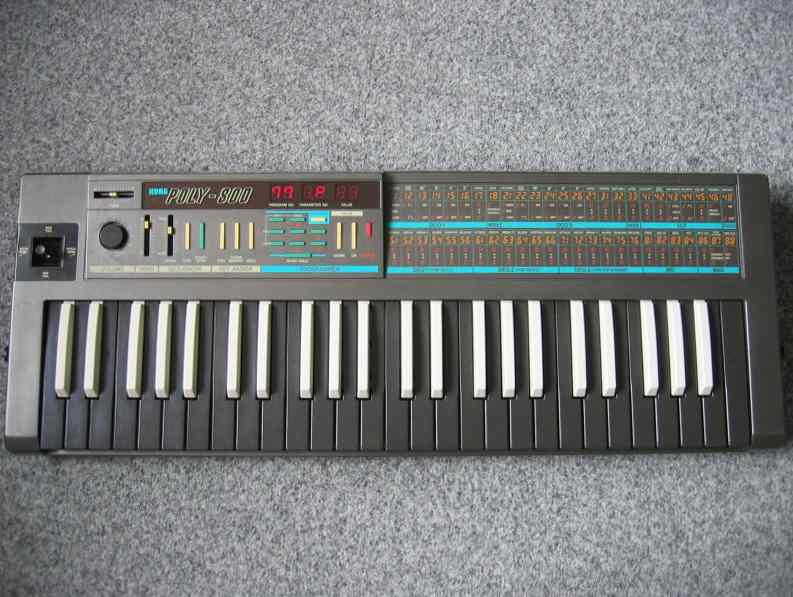 Sběratelský kus,léta nepoužívaný- součást sbírky. Raritní černobílá-reverzní klávesnice.Výborný stav. V polovině 80. let se na trhu objevil Korg Poly-800, první plně programovatelný syntezátor s cenou pod tisíc dolarů. Kromě klávesnice o rozsahu čtyř oktáv, joysticku pro ovládání levou rukou a bateriového napájení nabízel možnost zavěšení na krk a tím i více volnosti na pódiu, podobně jako kultovní Roland SH-101 nebo vůbec první „keytar“ Moog Liberation.
